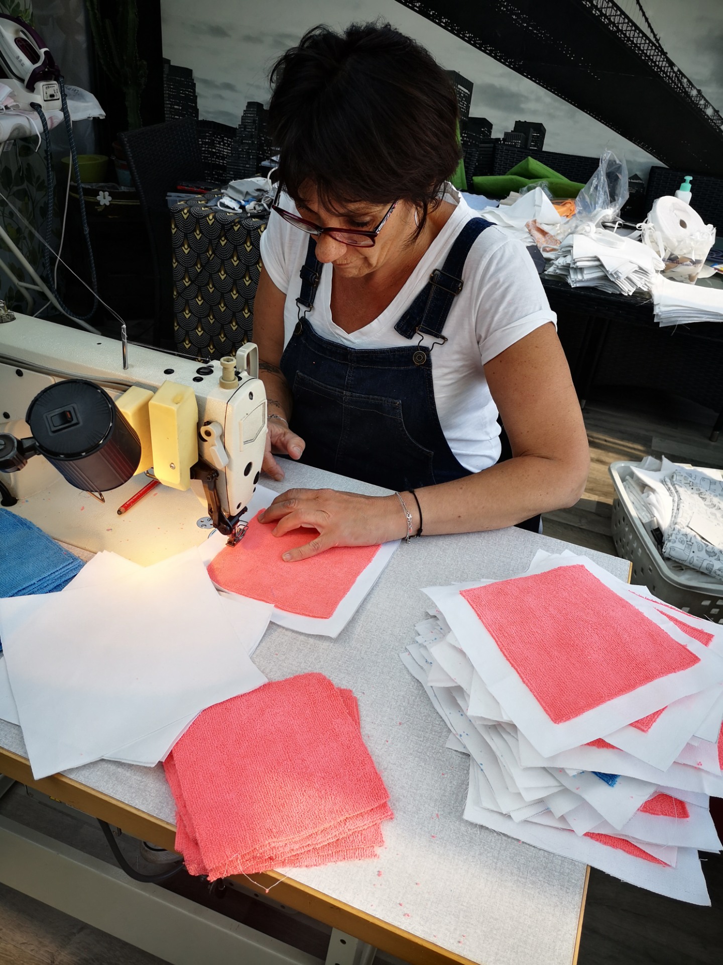 Très rapidement après le début de la période de confinement, la Ville a fixé un objectif ambitieux à notre couturière : la production de 2000 masques pour répondre aux besoins d’employés municipaux en première ligne ainsi qu’à ceux de publics fragiles. « J’ai quitté mon atelier du chantier municipal pour travailler à mon domicile. Ma machine à coudre professionnelle y a aussi temporairement trouvé refuge et j’ai emmené le stock de fournitures en ma possession : des élastiques, des tissus qui devaient initialement servir à la confection de draps, d’autres qui m’avaient été gracieusement donnés par des Sottevillais suite à l’article dans le bulletin municipal, et enfin des lavettes microfibres qui servent de filtre à l’intérieur du masque. Depuis, mes journées sont rythmées par la découpe et la préparation des différentes pièces requises, une étape assez longue, puis j’enchaîne avec la couture pour les assembler. En moyenne, j’en fabrique près d’une trentaine par jour. Je fais donc avec les moyens du bord. Pour l’heure, mes masques sont plutôt neutres, mais certains arborent quelques motifs comme des licornes roses. L’originalité du tissu apporte un peu de légèreté en cette période. En revanche, je vais bientôt commencer à manquer d’élastiques et nous entamons donc des recherches ».